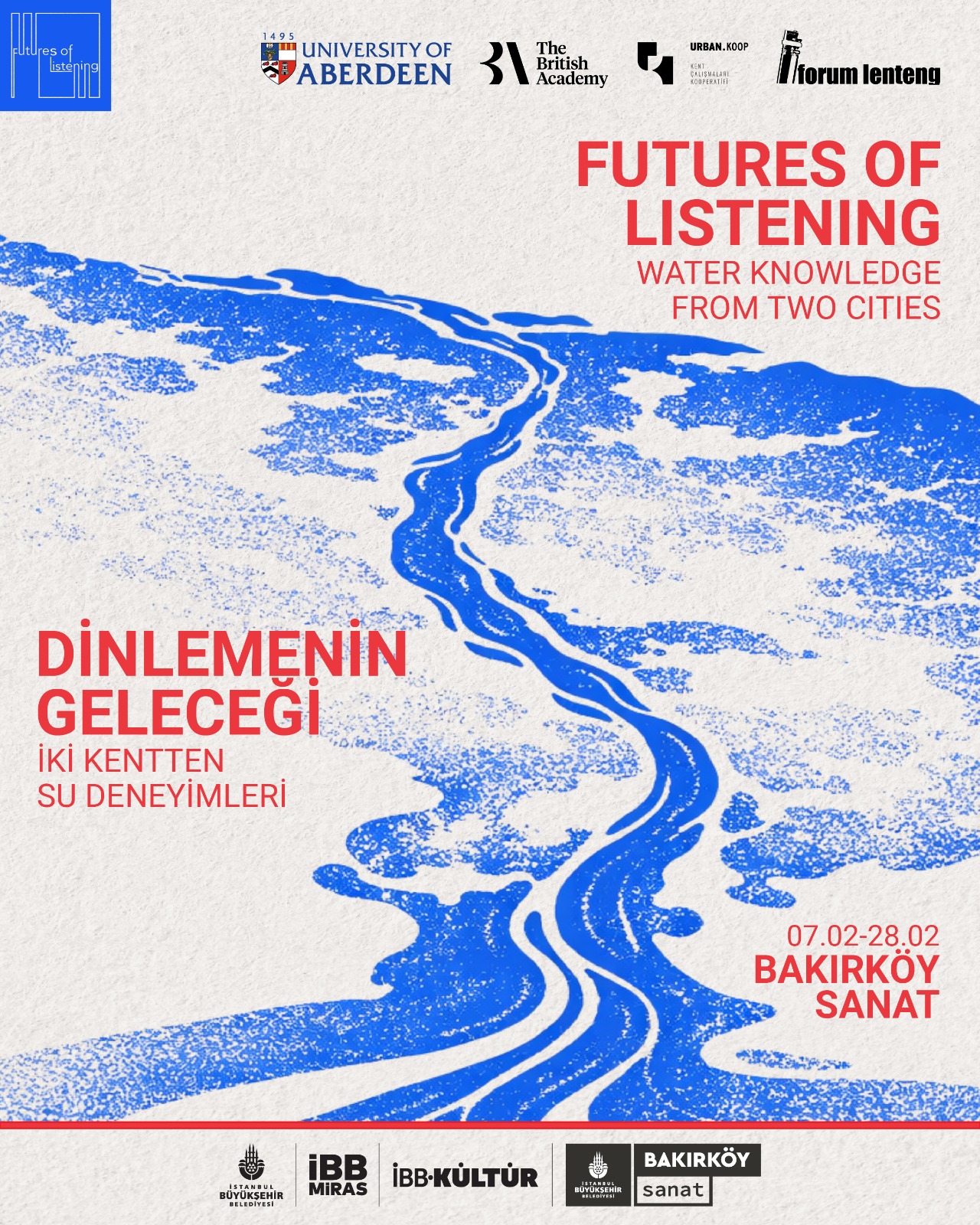 Aberdeen Üniversitesi, Urban.koop ve Forum Lenteng işbirliği ve British Academy desteği ile yürütülen “Dinlemenin Geleceği” (Futures of Listening) araştırma projesi, değişen su politikalarının su havzalarında yaşayan yerel toplulukların yaşamlarını nasıl etkilediği sorusunu soruyor. Bu soruya yanıt ararken yöntem olarak dinleme eylemini merkeze alan araştırma, insan hikâyelerini, sesleri ve kent yaşamının gündelik ritmini dinlemeyi ve bunları kayıt altına almayı amaçlıyor. Kentin ve insanların söyleyecek bir sözü, çıkaracak bir sesi ve anlatacak bir hikâyesi olduğu varsayımıyla hareket eden “Dinlemenin Geleceği” projesi, bu hikâyeleri belgelemenin ötesinde, onlara anlatılabilecekleri bir alan açmayı ve dinlemeye dayalı bir karşılaşma zemini kurmayı hedefliyor. Hikâye anlatıcısına yer açmak ve bazen yalnızca dinlemek… Bu anlatıcı kimi zaman mekânın bir sakini, kimi zaman ise bizzat mekânın kendisi olabiliyor.